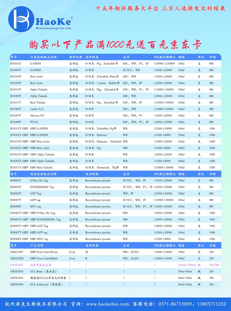 促销活动 实验党速来👀浩克生物这波太香了!抗体高效反应液 30min+ 搞定 WB省二抗步骤操作超省心💨现在买指定产品满 1000 送百元京东卡🎁实验提速还能薅羊毛,冲就完事儿~ 上一篇: 耗材买四送一重磅来袭 推荐 耗材买四送一重磅来袭 2025年3月21日 1080 年中大促来袭 培养板等多种耗材买四送一,优惠不断!!! 浩克&百迪带来更多惊喜!!! 查看全文 劲爆限时优惠活动 2025年2月8日 1003 活动说明: 查看全文 发SCI文章,领巨额奖励! 2024年10月21日 1520 二、奖励兑换流程 查看全文 暖冬福利 2024年12月10日 1287 活动说明: 1.活动抗体为Proteintech品牌常规一抗(不含重组兔单抗、流式抗体、标签内参抗体、同型对照抗体、中和抗体、抗体组合装、抗体对及PBS-only抗... 查看全文